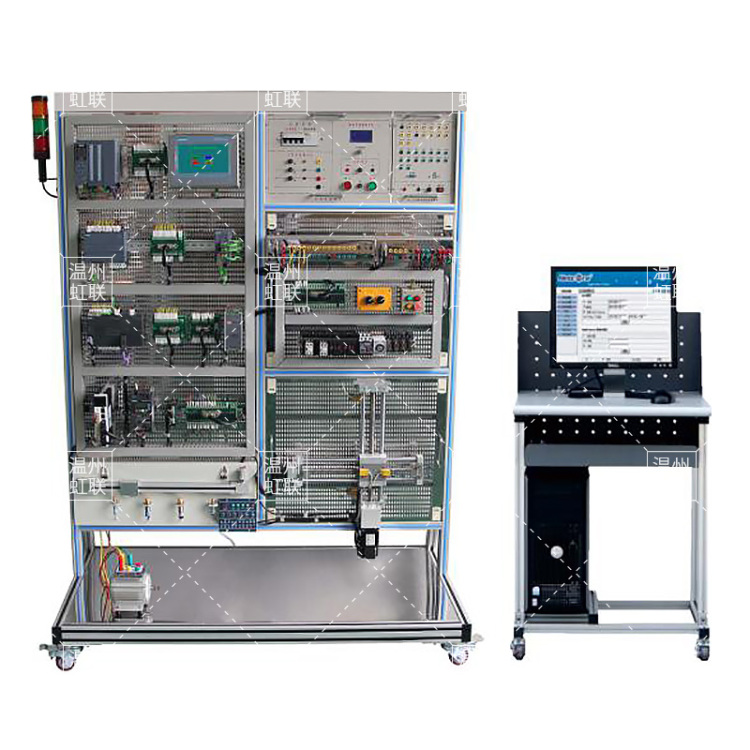 实训装置由S7-1200单元、变频调速单元、小车运动控制单元、实训组件、电工基础实训单元二维丝杆控制单元、触摸屏单元、以太网交换机、交流电机等组成。