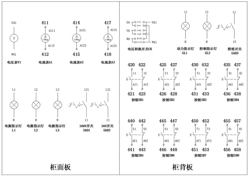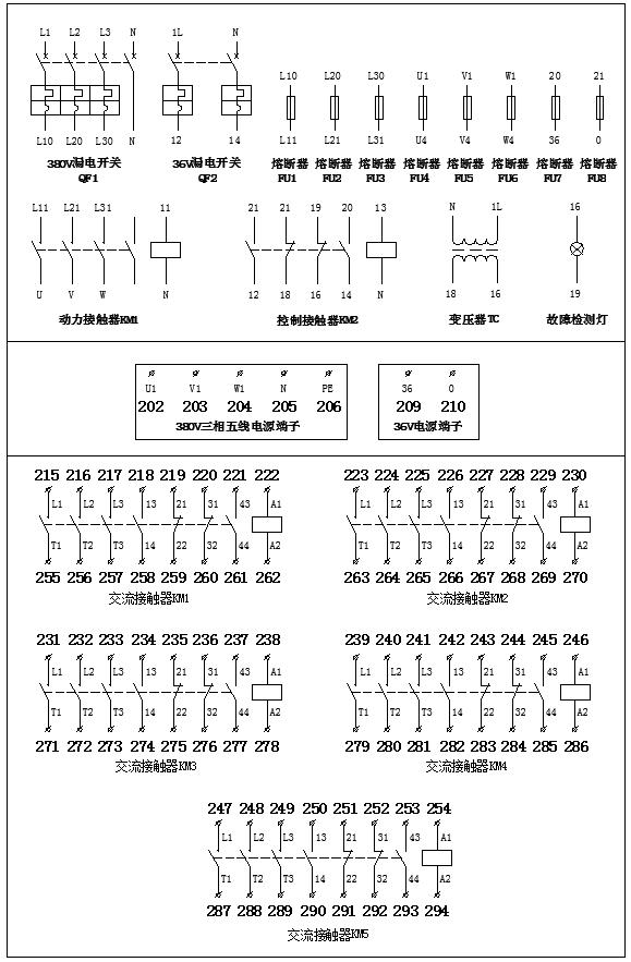 3、 设备配置:本设备按标准电气控制柜设计制作,安装有完成各种电气控制所需要的多种低压电器,如:漏电断路器、电压表、电流表、按钮、信号灯、熔断器、报警装置、电流互感器、接触器、时间继电器、中间继电器、热继电器、行程开关、转换开关、整流二极管、电动机等。内含:三相电源开关(单、三相断路器各1只)、熔断器5只、交流接触器3只;电动机1只、电流互感器3只、热继电器2只、中间继电器2只、时间继电器2只、行程开关4只、接线端子若干。